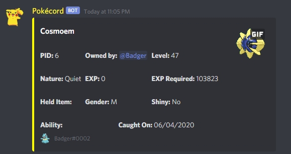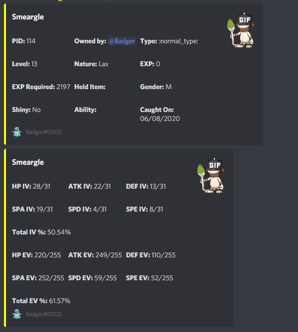 p!stats <pokémon ID> - List your pokémon's statistics (Name, Level, EXP, Required EXP, Type, Held Item, Gender, Shiny, Nature, Ability, Owner, Caught Date)