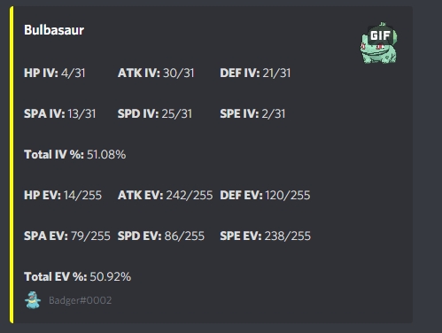 p!ratings <pokémon ID> - List your pokémon's (IVs, EVs, Total IV %, Total EV %)