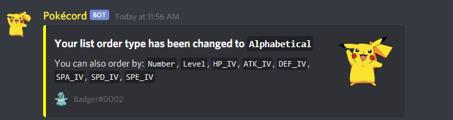 p!order <option> - Order your p!list by options such as alphabetical, number, level, or IV
