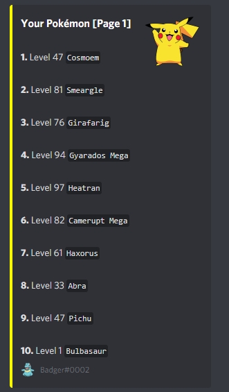 p!list <page> - List your owned pokémon (supply no page number for page #1)